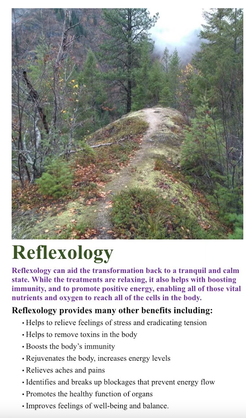 Reflexology is a relaxing service that assists in alleviating stress. The theory behind reflexology is that areas of the foot correspond to organs and systems of the body. Pressure applied to the foot is believed to bring relaxation and healing to the corresponding area of the body.