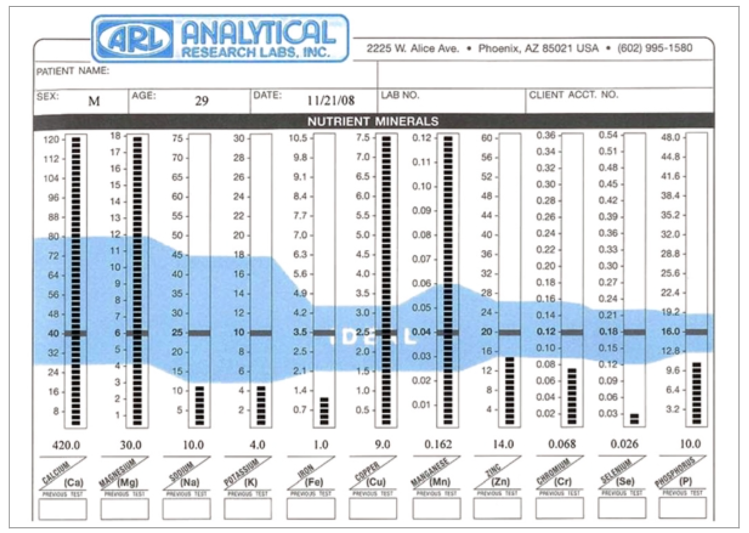 Test results are printed on an easy-to-read graph, unlike many of the other laboratories. This is a great benefit for both practitioners and their clients as well. The printed graph includes the mineral results, major mineral ratios and the oxidation type.