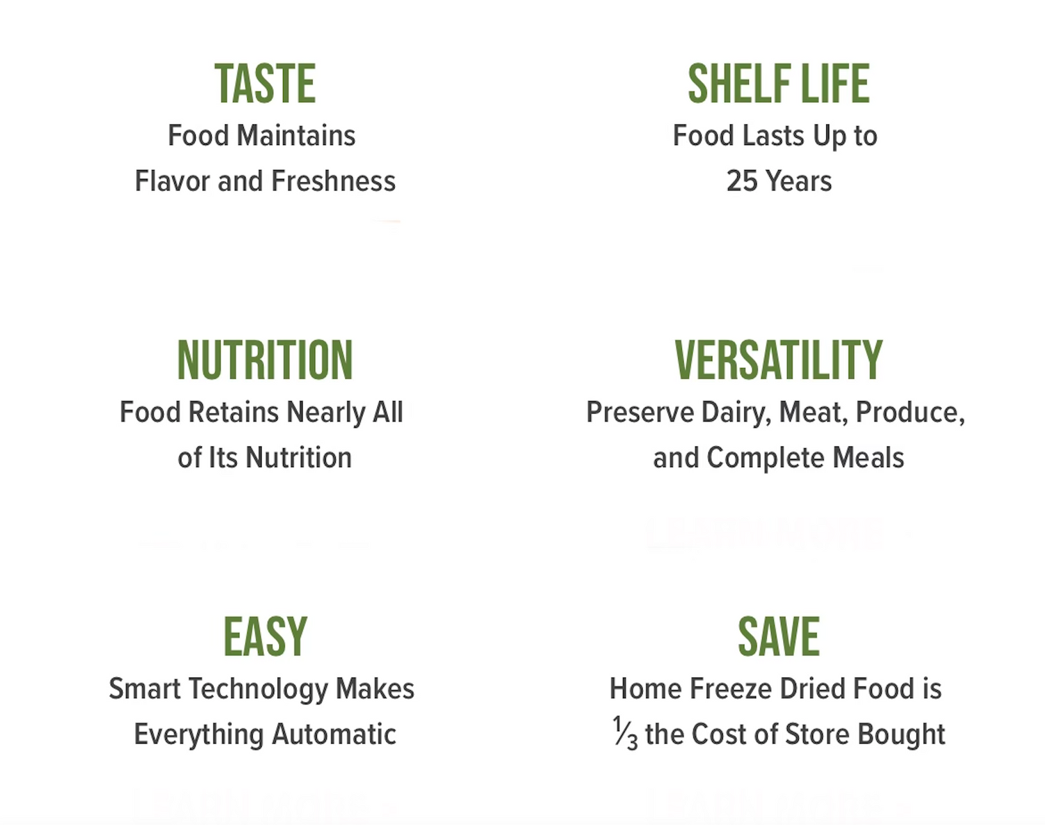 Preserve your garden produce, create the perfect emergency food supply, make camping meals and healthy snacks. Unlike other methods of food preservation, freeze drying does not shrink or toughen the food, and retains flavor, color, and nutrition.